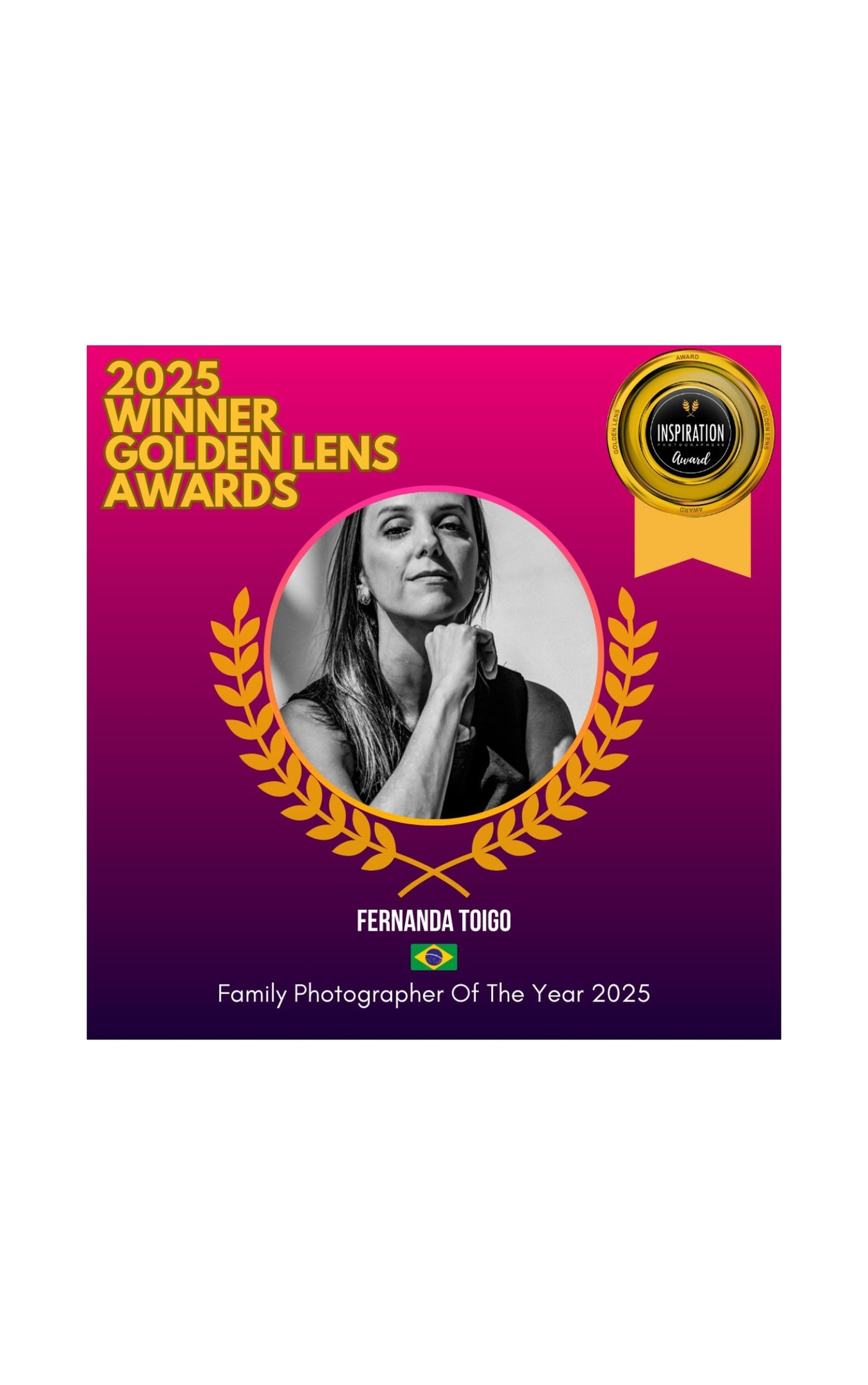 2025 foi um ano intenso e generoso: 102 trabalhos, cerca de 60 mil imagens entregues, 59 menções honrosas, 99 fotos premiadas, 7 Best Collections e a conquista do Golden Lens como Melhor Fotógrafa de Família do Mundo, além de ter sido jurada em concursos de fotografia e compartilhar seu olhar em palestras para fotógrafos e empresários.